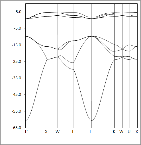 If "Diamond for electronics.brz" is opened using BZ, various walks in k-space can be generated. One of the more informative walks is Γ-X-W-L-Γ-K-W-U-X, shown in Figure E1. This figure, generated by BZ, is of some use (as shown here), but not easy to edit. When BZ is run, in addition to the simple graphic, it also produces a file that ends in ".txt" that contains all the information that was used in making the graphic. This information can then be using in Excel to make a chart that can easily be edited to add axes, text boxes, etc. An example is shown in Figure E2.