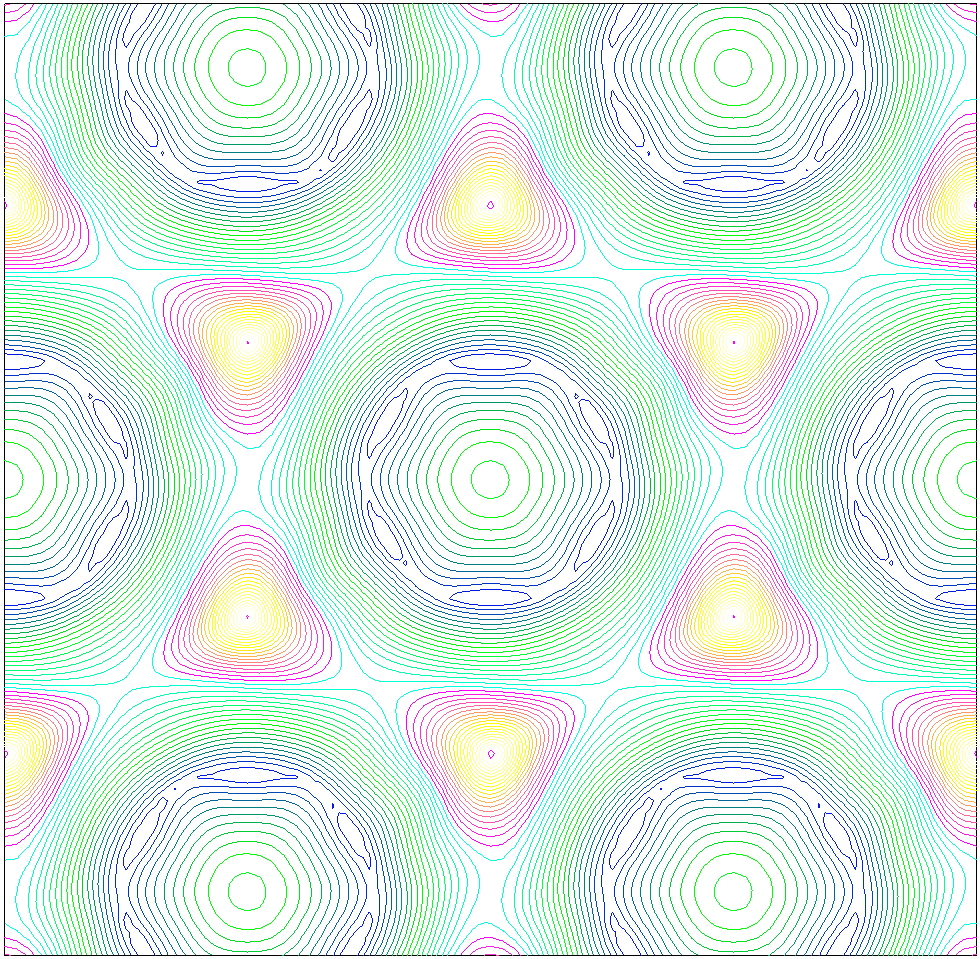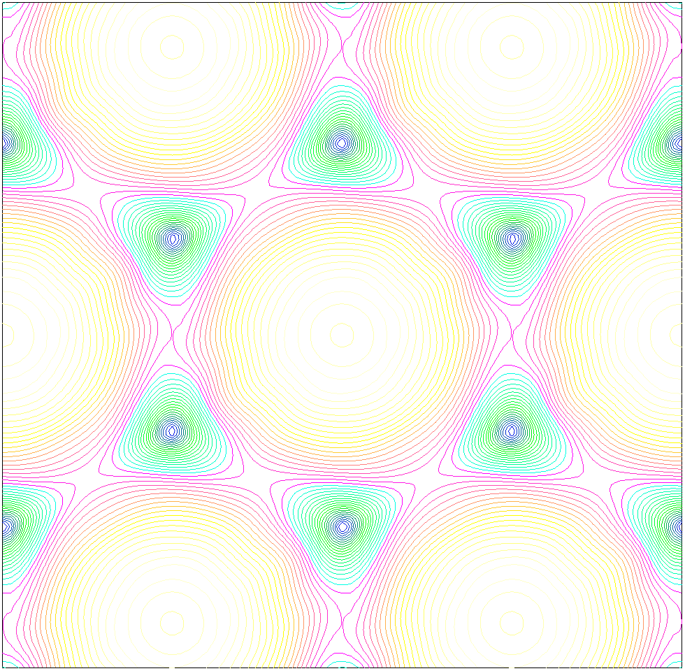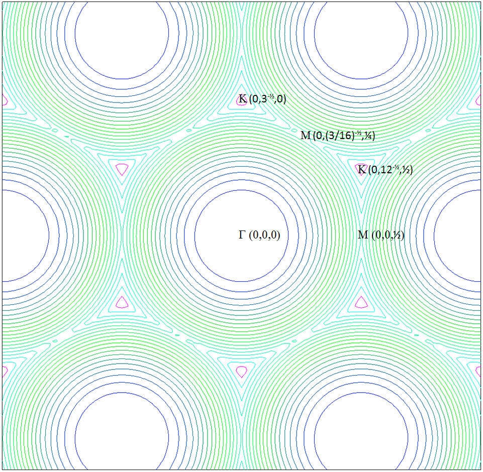 Lines through k-space are useful in showing the overall energy spectrum, but are limited in that they do not convey much information about the overall shape of individual bands. A more useful picture is provided by a two-dimensional cut through k-space. An example of such a section, centered on Γ and perpendicular to the Δ line is shown in Figure E2. Three points of interest, Γ, K and M are indicated, along with their coordinates in k-space.