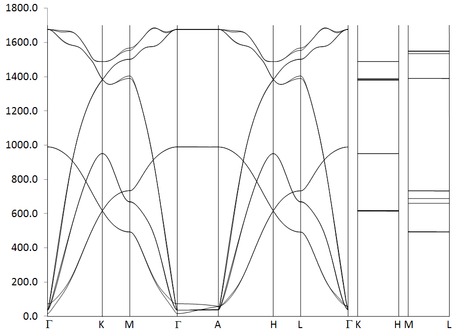 Using the 3x5x5 LUC a reasonable phonon band structure was generated, Figure P1. Figure P2 shows the 3-D Excel map of Band 1, in the plane perpendicular to the unique axis, and centered on Γ. As with the electronic structure, the phonon structure shows many of the qualitative features expected, e.g., bands crossing and the degeneracy at K. A requirement of phonon spectra, that the lowest vibrational frequency should be 0.0 cm-1, was almost achieved. That the lowest vibrational frequency was 15.2 indicates that there is some error in the phonon calculation. However, errors in vibrational frequencies due to computational issues tend to be largest in the lowest frequencies, and at higher frequencies the errors attributable to computational effects decrease to about 1 cm-1.
