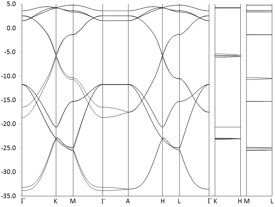 Four carbon atoms contribute 16 valence electrons, so eight bands are occupied. Over much of the Brillouin zone there is a distinct band-gap between the occupied and empty bands, the exception being at the region of line P, i.e., in the region connecting points K and H. In this region the band-gap drops to almost zero.