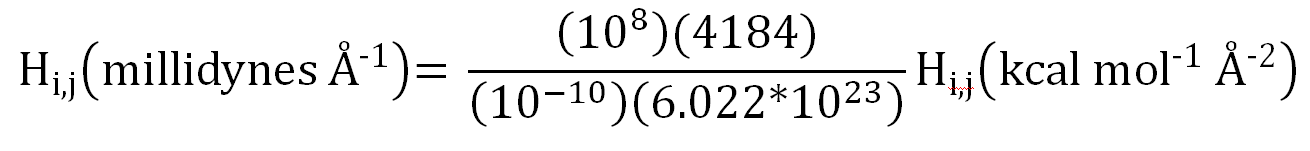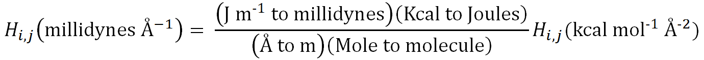 Millidynes per Angstrom per amu = (102 x 103 x N) J m-2 kg-1 = (105 x N) Newton m-1 kg-1