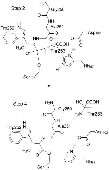 ![]() In this reaction, the proton on His57 should migrate to the peptide nitrogen of Thr253 and the peptide bond between Trp252 and Thr253 should break. Instead, the reaction goes backwards to the Step_1_2_Transition_state. Toggle display all Toggle center picture Fit to screen Interesting parts: