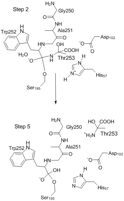 ![]() In this reaction, the proton on His57 should migrate to the peptide nitrogen of Thr253 and the peptide bond between Trp252 and Thr253 should break. Instead, as with the Step 2 - Step 4 reaction, the lowest barrier involves going backwards to the Step_1_2_Transition_state. Toggle display all Toggle center picture Fit to screen Interesting parts: