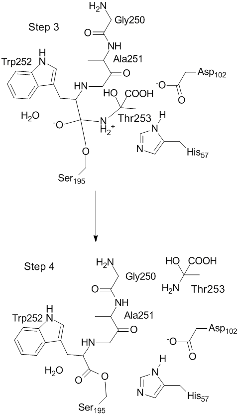 ![]() There is no transition state for the reaction Step3 → Step 4. At the start of this reaction, the peptide bond is a Zwitterion. As the bond between Trp252 and Thr253 is steadily stretched, the peptide bond weakens, and the Zwitterionic nature changes and two neutral species are formed. This reaction is activationless. Frame 1, 2, 3, 4, 5, 6, 7, 8, 9 Palindrome Animation Animation off Atoms within 5 Å Atoms within 9 Å All Atoms |
