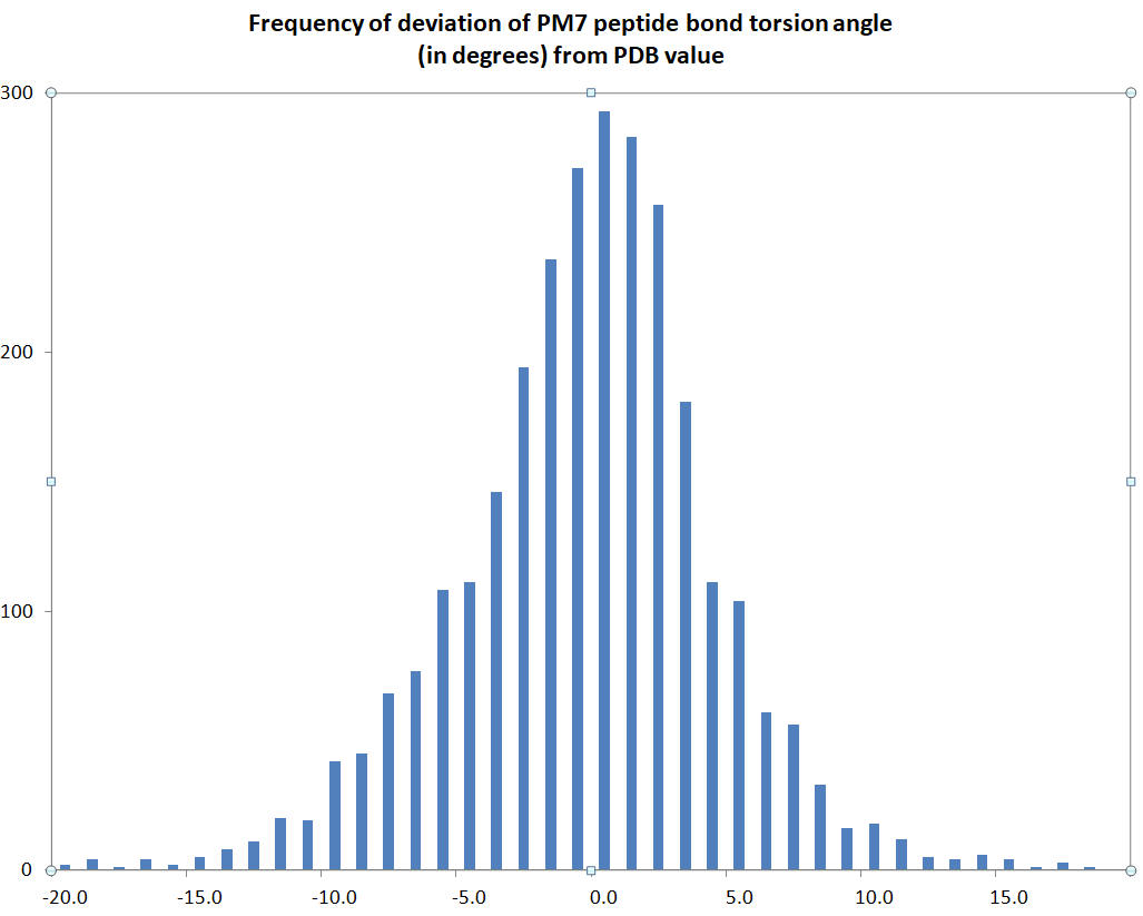 An estimate of the accuracy of prediction of the peptide twist angle ω can be obtained by comparing the calculated PM7 twist angles with those found in PDB structures. A set of 2833 peptide bonds found in ten proteins deposited in the PDB in March 2021 was used in making this comparison. The histogram of the difference between the calculated and observed torsion angles is shown in the chart. To see the raw data, download Ramachandran. As expected, the calculated torsion angles are more often less than that observed, as can be seen at -10 and 10 degrees difference.