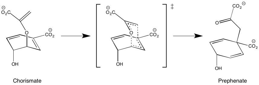 From Wikipedia, the mechanism for the reaction in Chorismate Mutase can be summarized as follows: